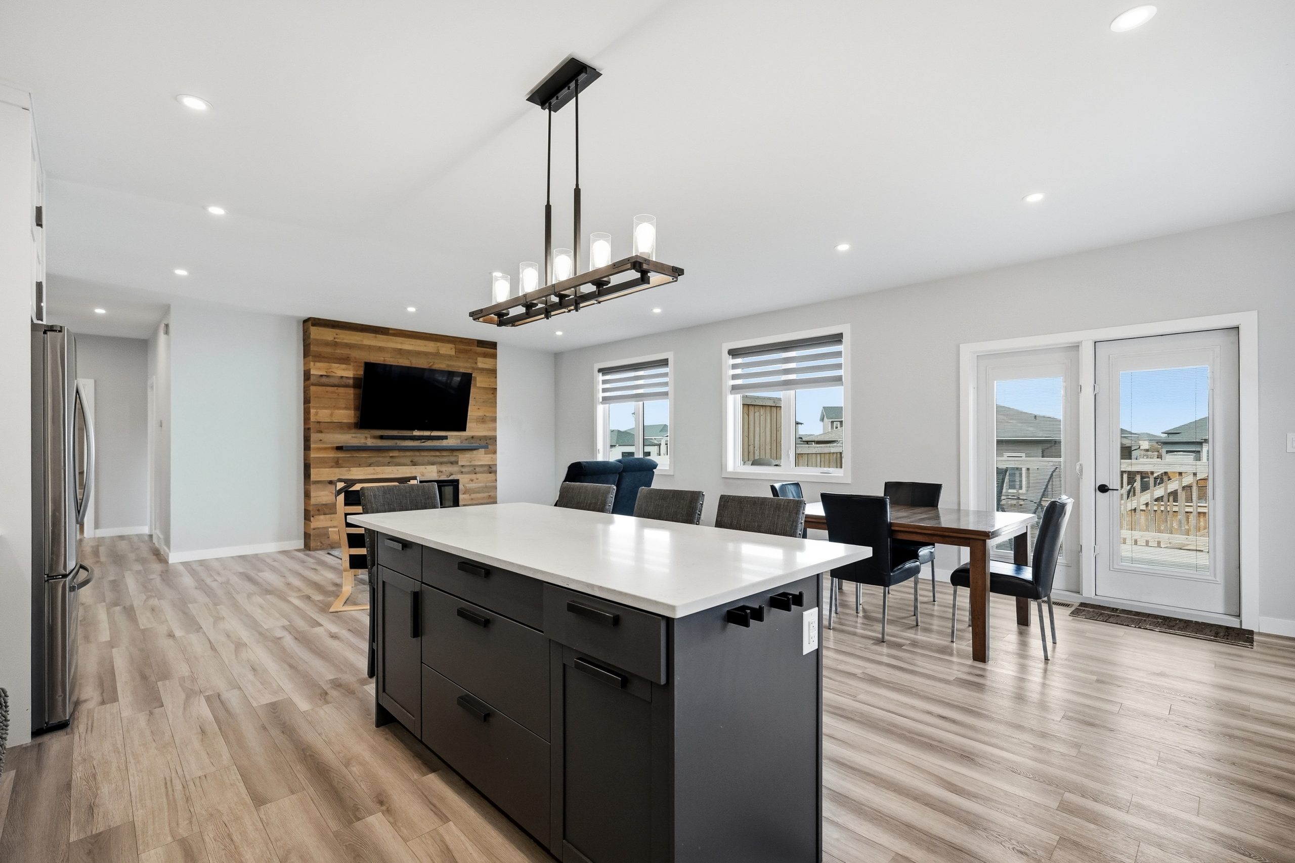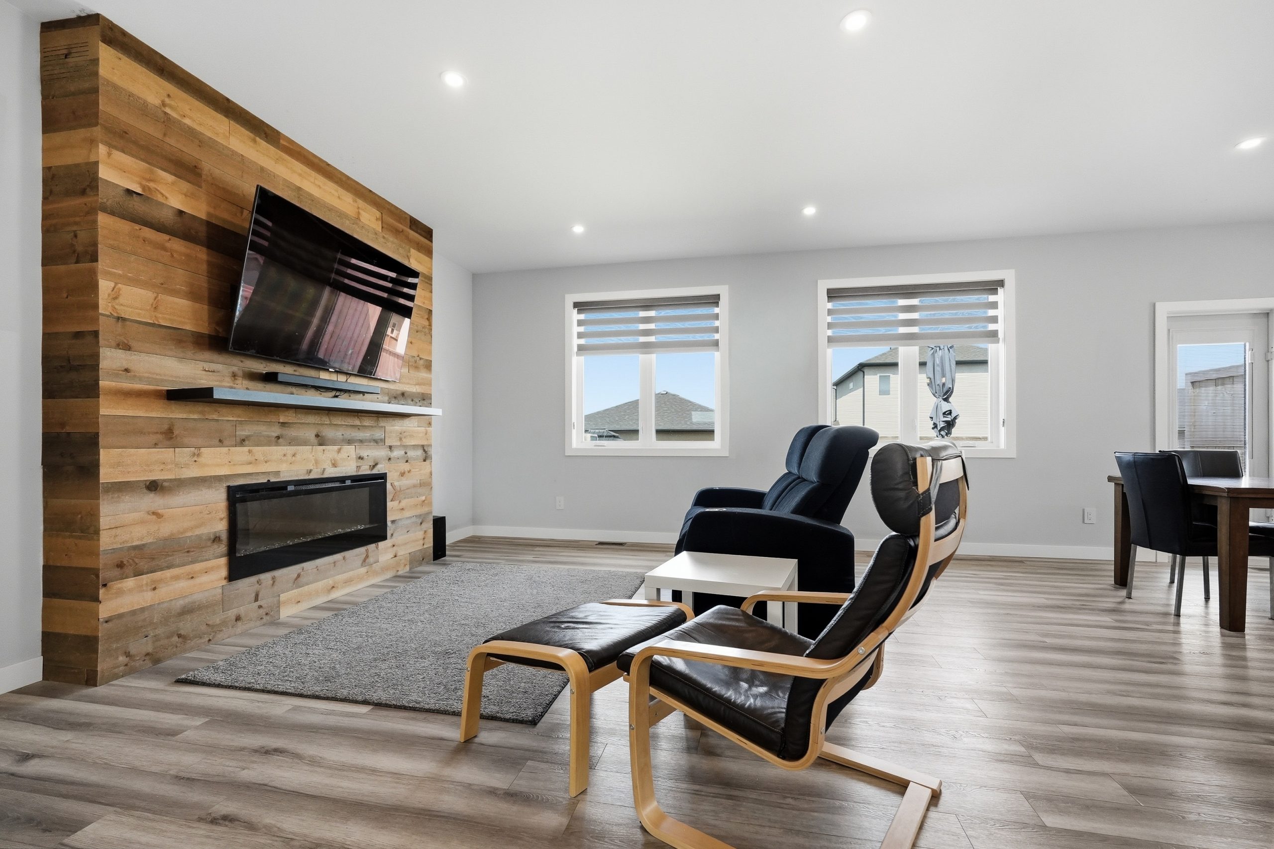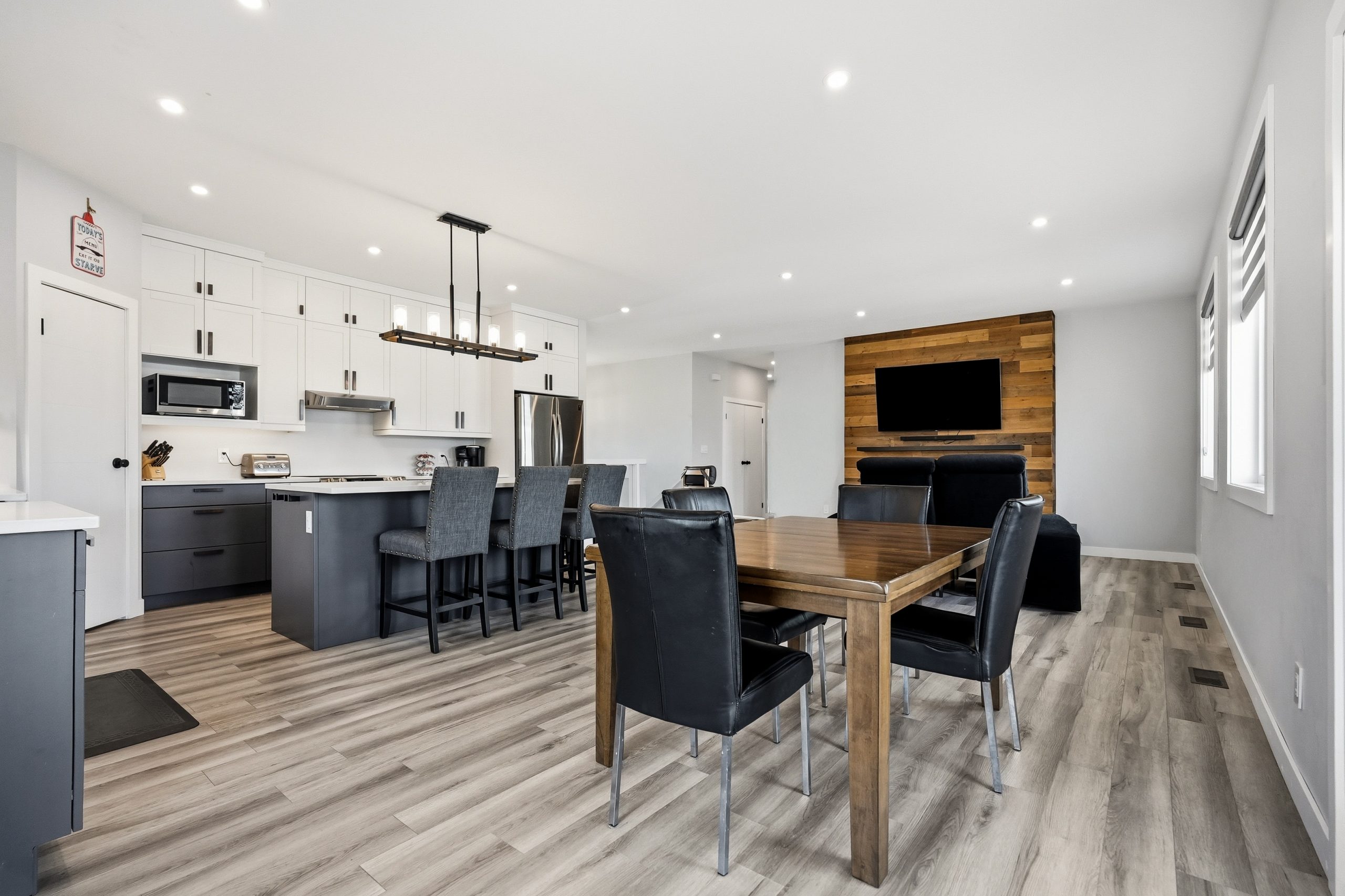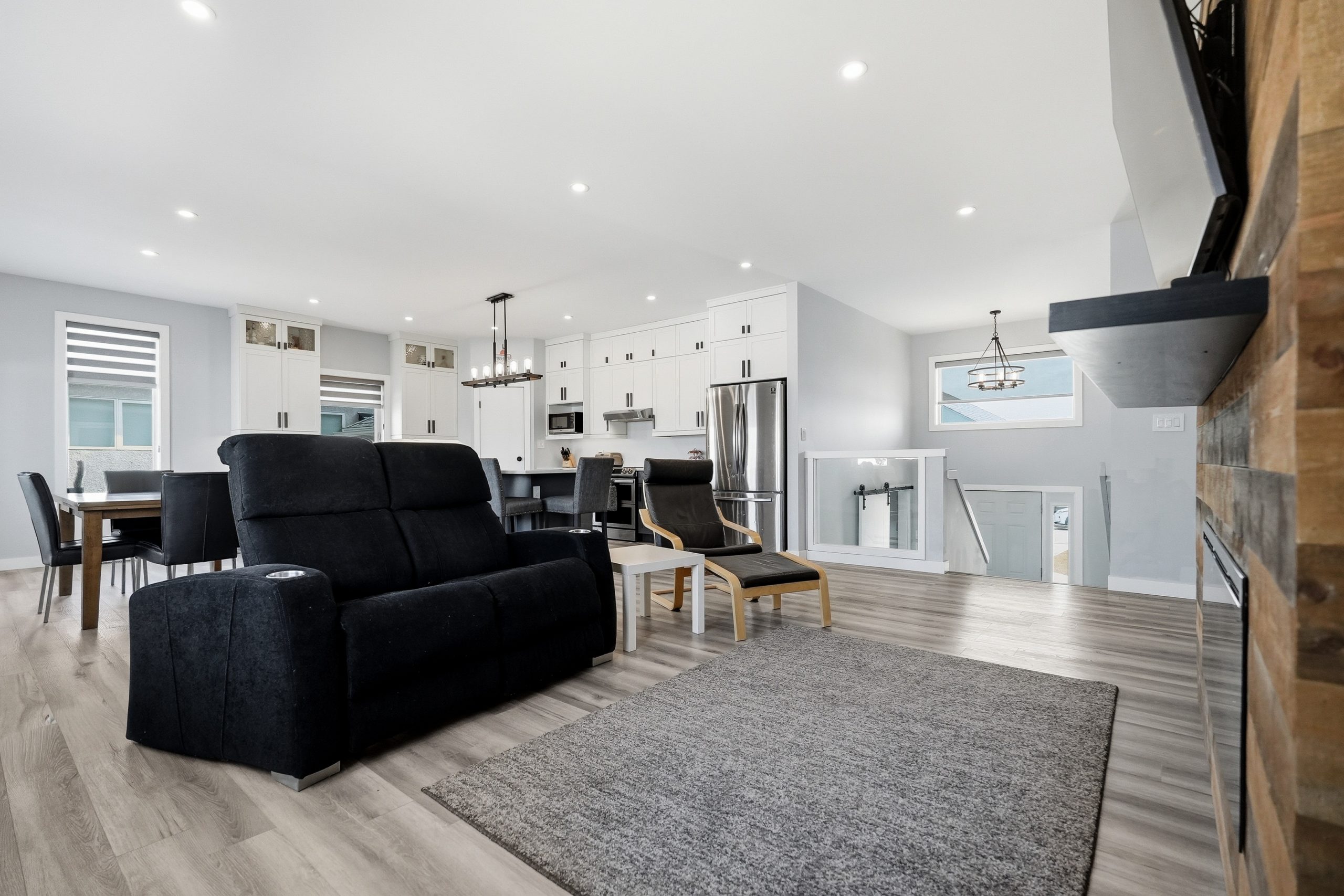The bright open-concept main floor is designed for both everyday comfort and entertaining. The kitchen features two-tone cabinetry to the ceiling, quartz countertops, full wood drawers, under-cabinet lighting, stainless barn sink, and direct access to the rear deck. The living room is anchored by an electric fireplace with reclaimed wood feature wall.