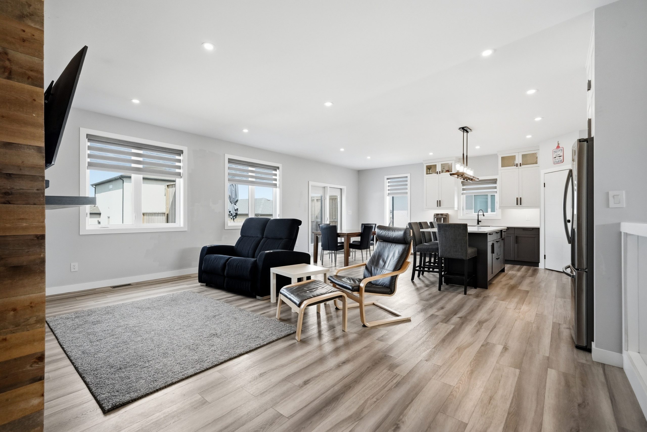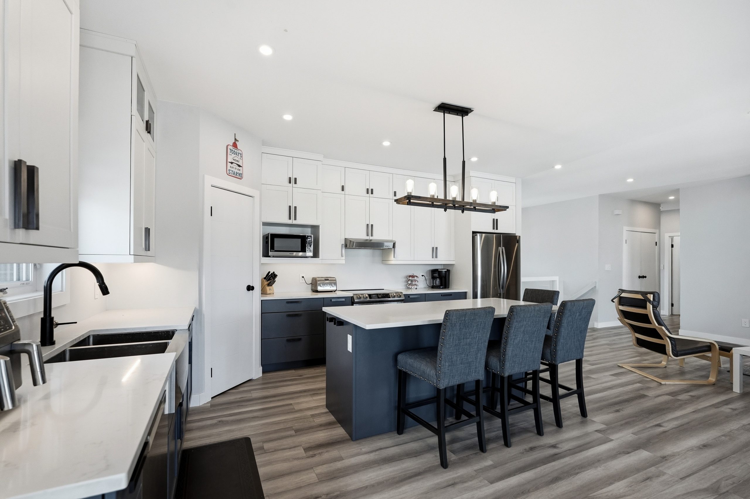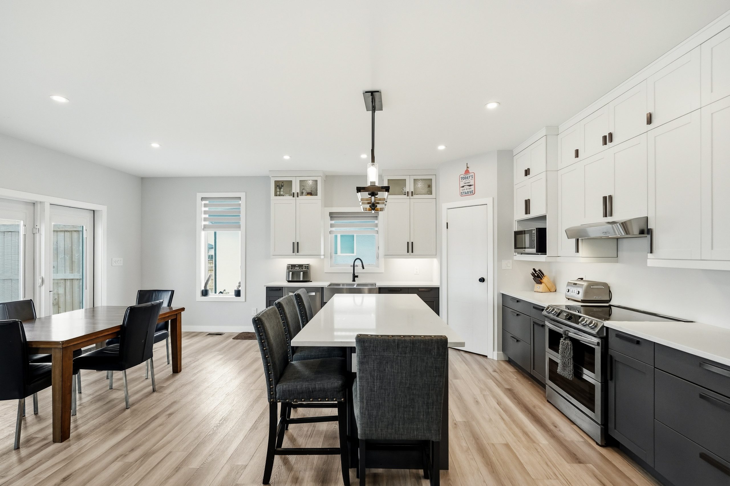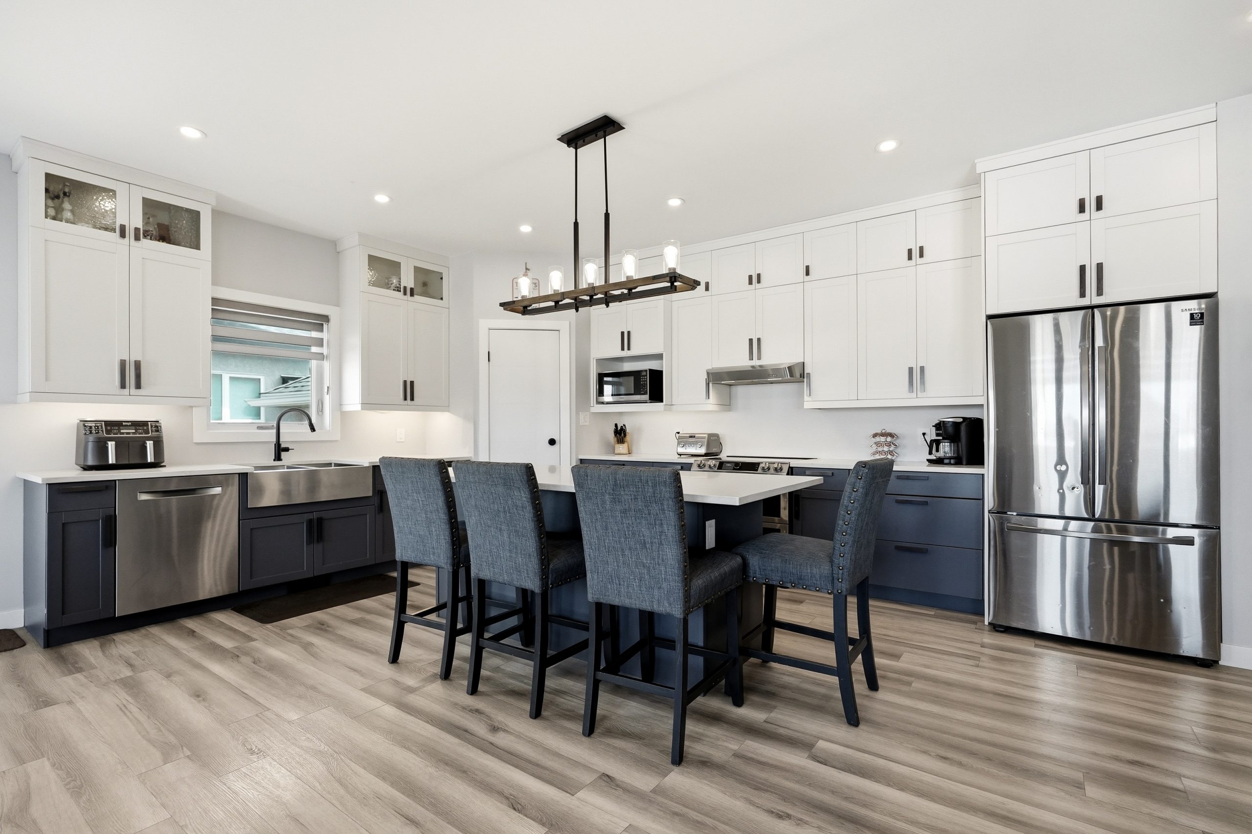 The bright open-concept main floor is designed for both everyday comfort and entertaining. The kitchen features two-tone cabinetry to the ceiling, quartz countertops, full wood drawers, under-cabinet lighting, stainless barn sink, and direct access to the rear deck. The living room is anchored by an electric fireplace with reclaimed wood feature wall.