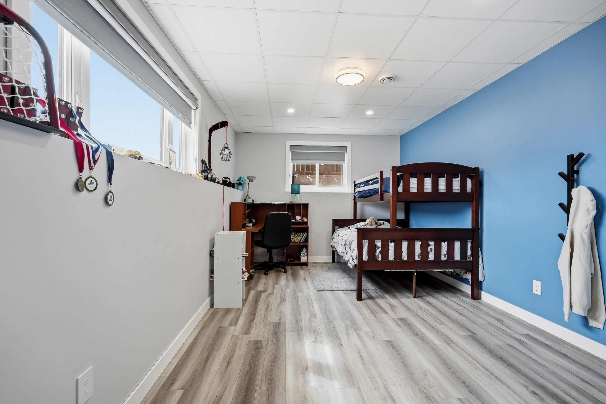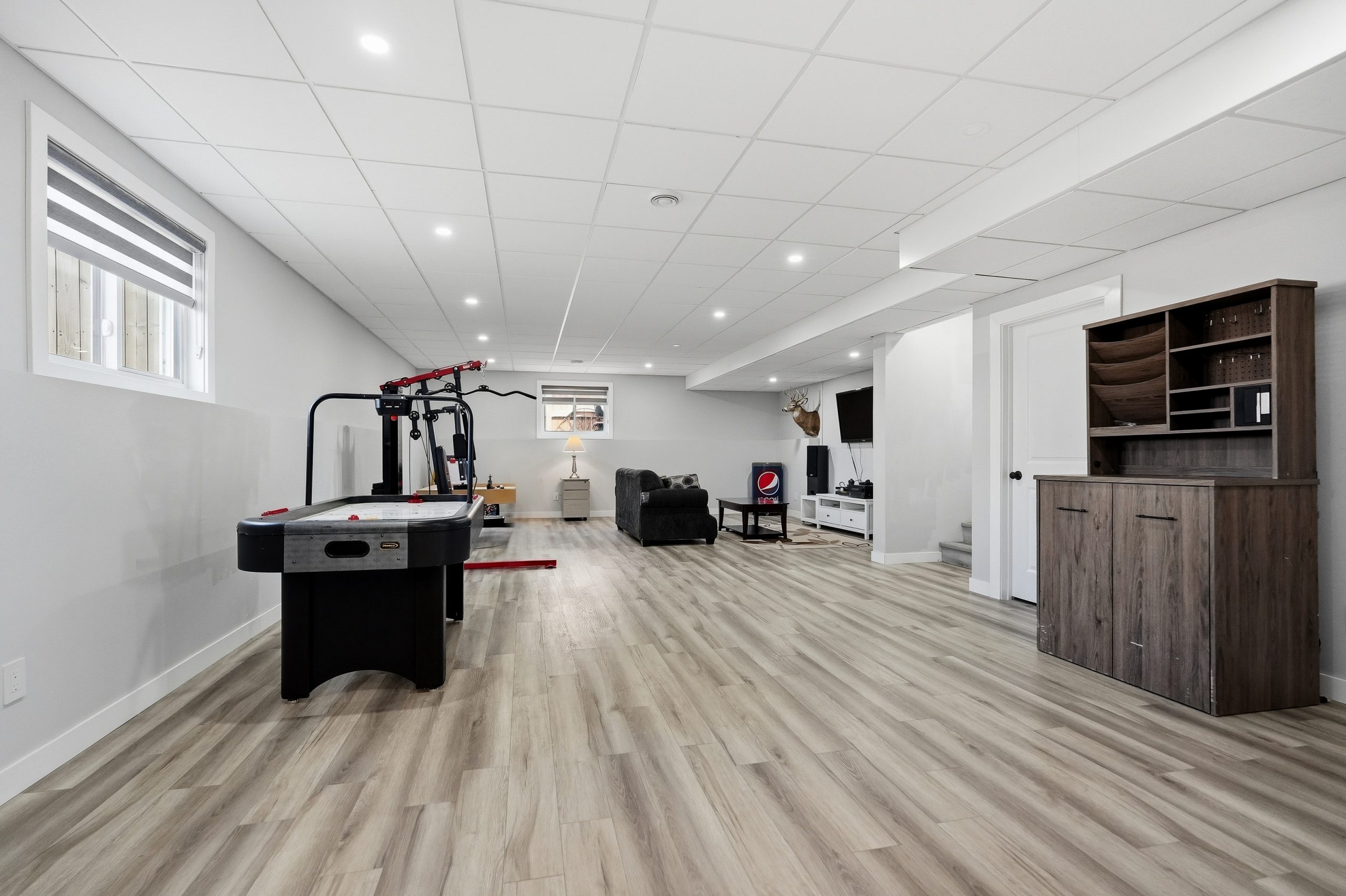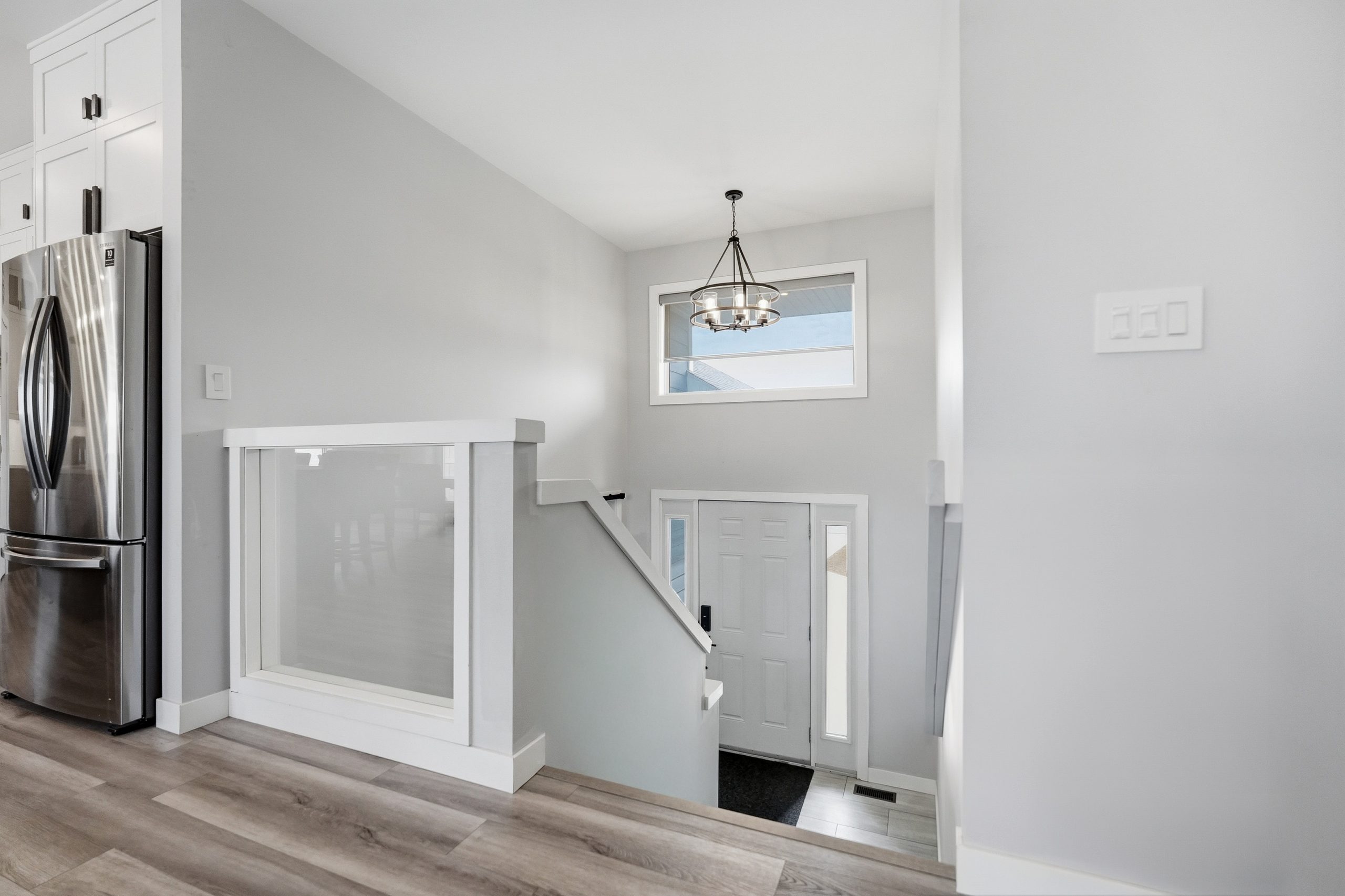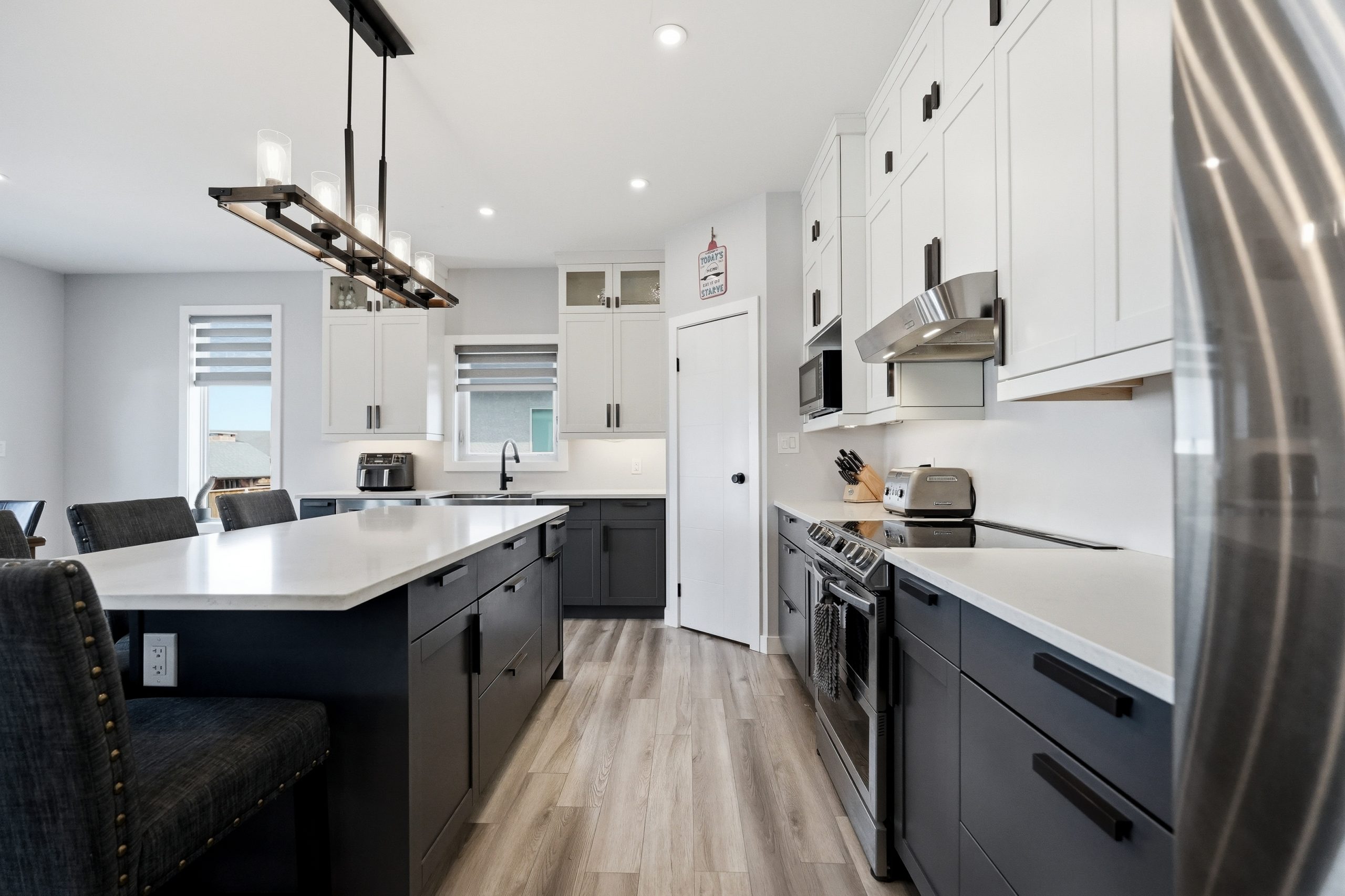 The bright open-concept main floor is designed for both everyday comfort and entertaining. The kitchen features two-tone cabinetry to the ceiling, quartz countertops, full wood drawers, under-cabinet lighting, stainless barn sink, and direct access to the rear deck. The living room is anchored by an electric fireplace with reclaimed wood feature wall.