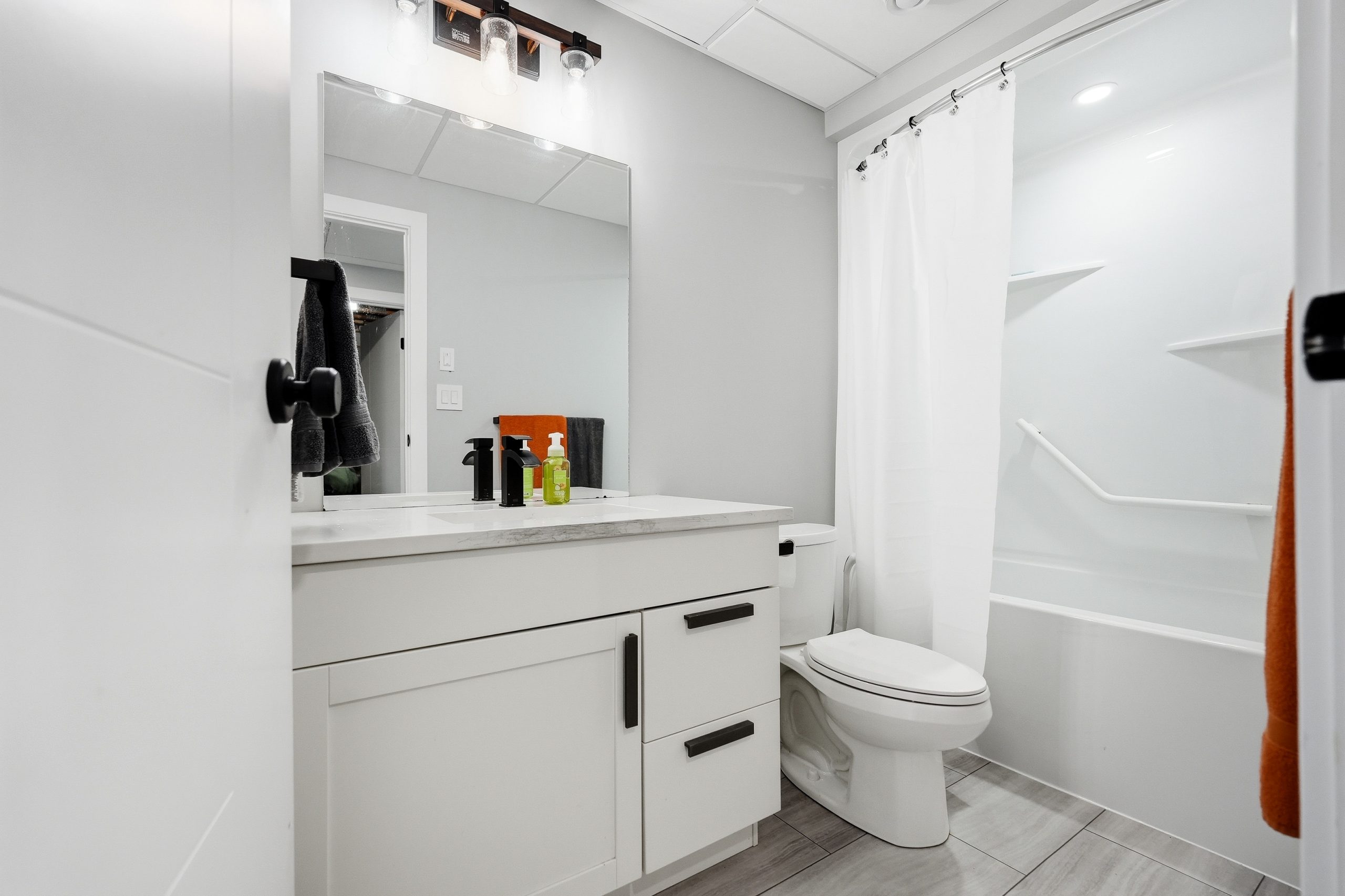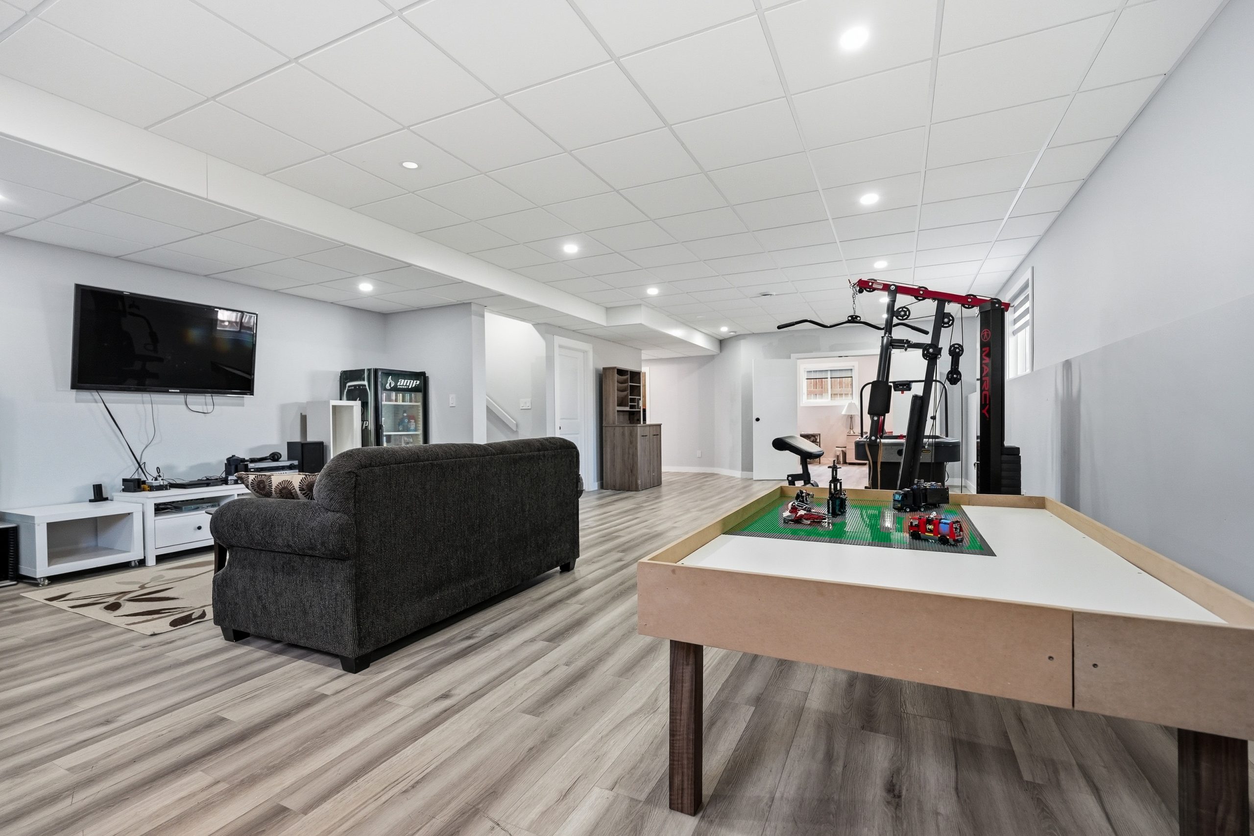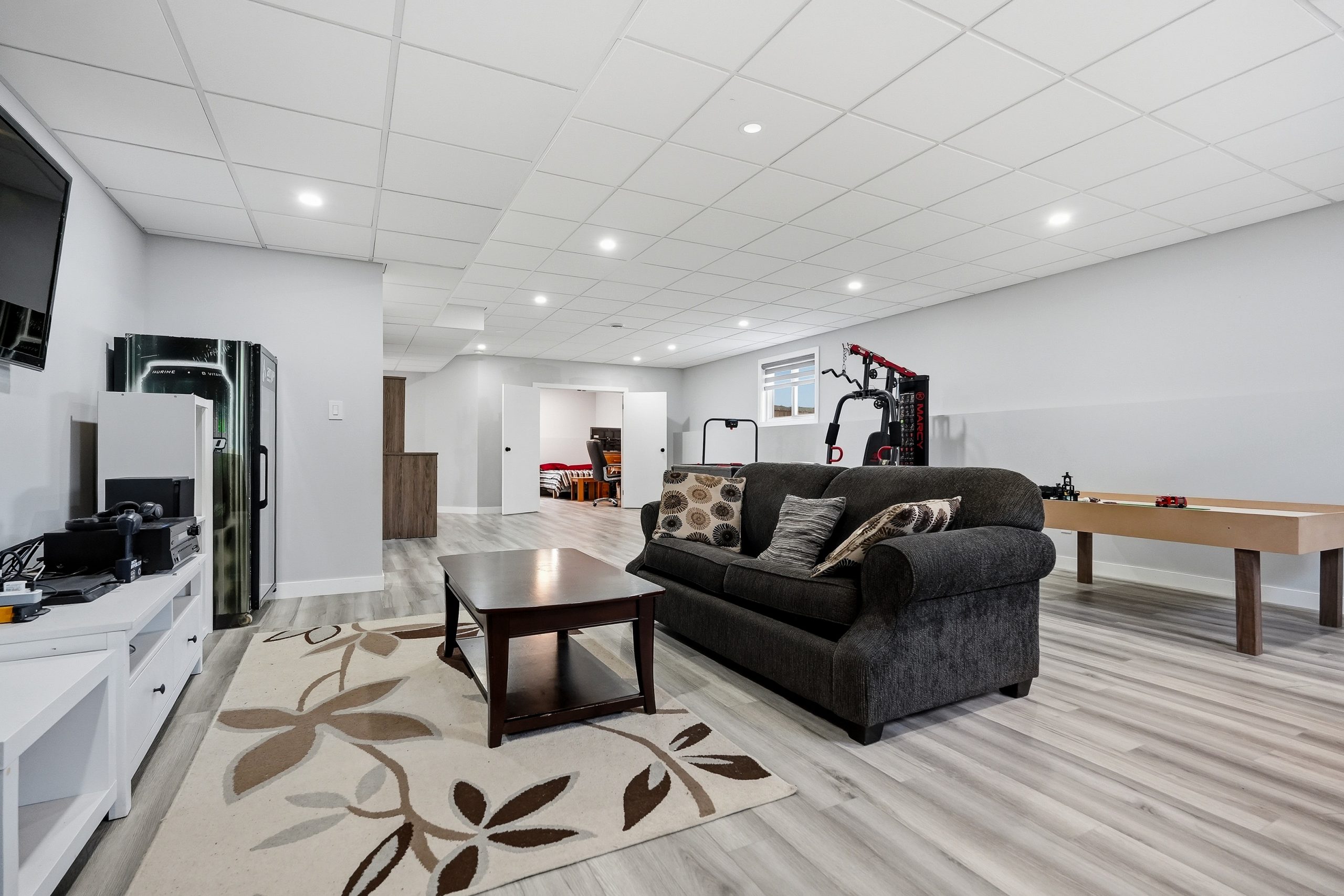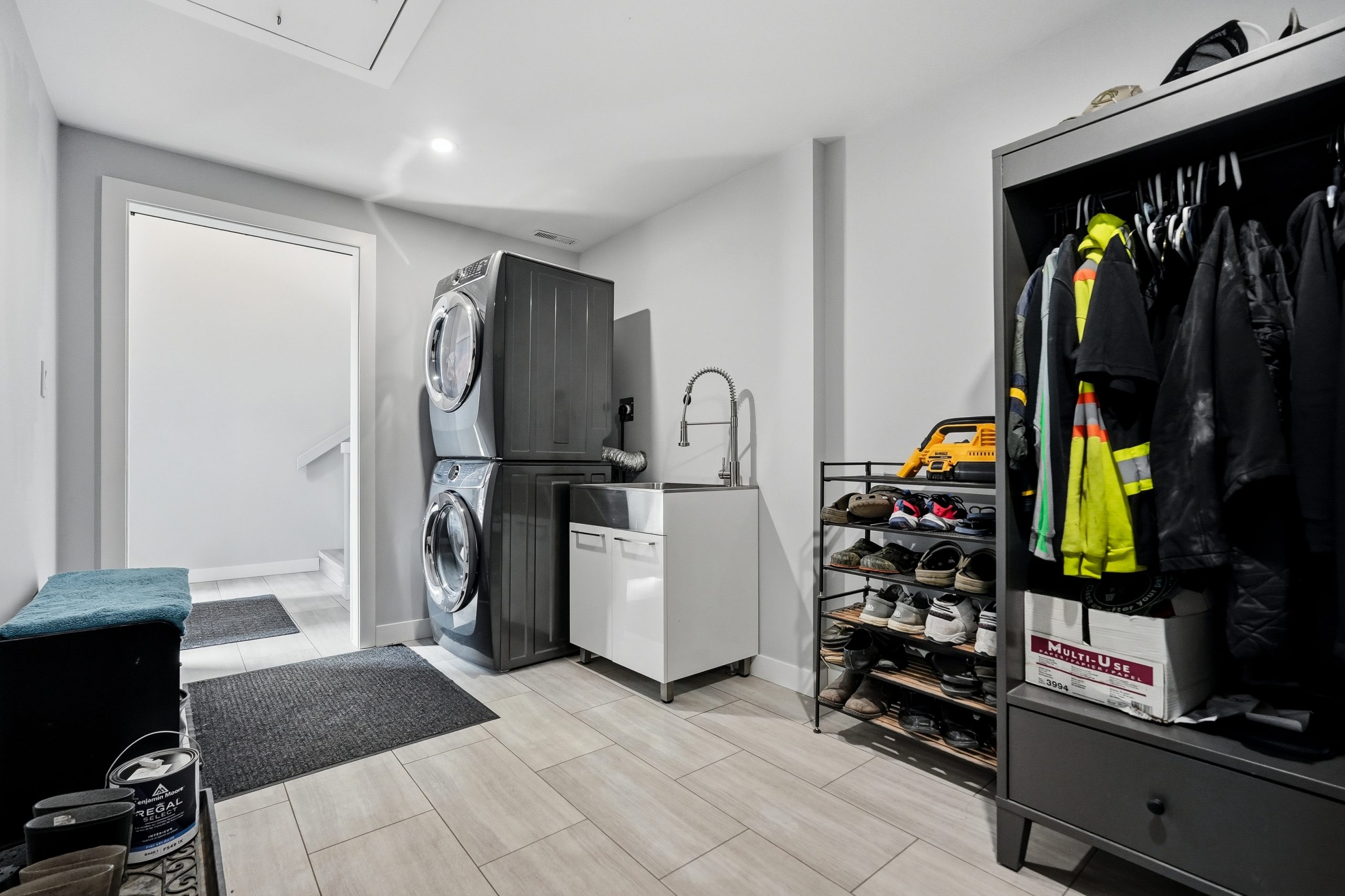 The bright open-concept main floor is designed for both everyday comfort and entertaining. The kitchen features two-tone cabinetry to the ceiling, quartz countertops, full wood drawers, under-cabinet lighting, stainless barn sink, and direct access to the rear deck. The living room is anchored by an electric fireplace with reclaimed wood feature wall.