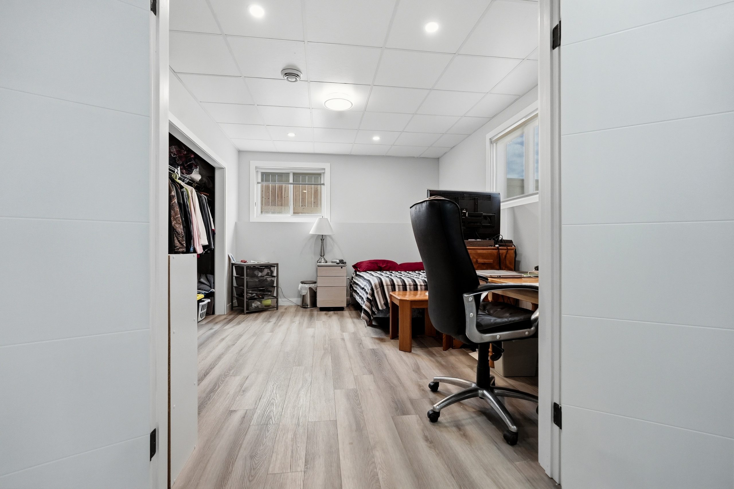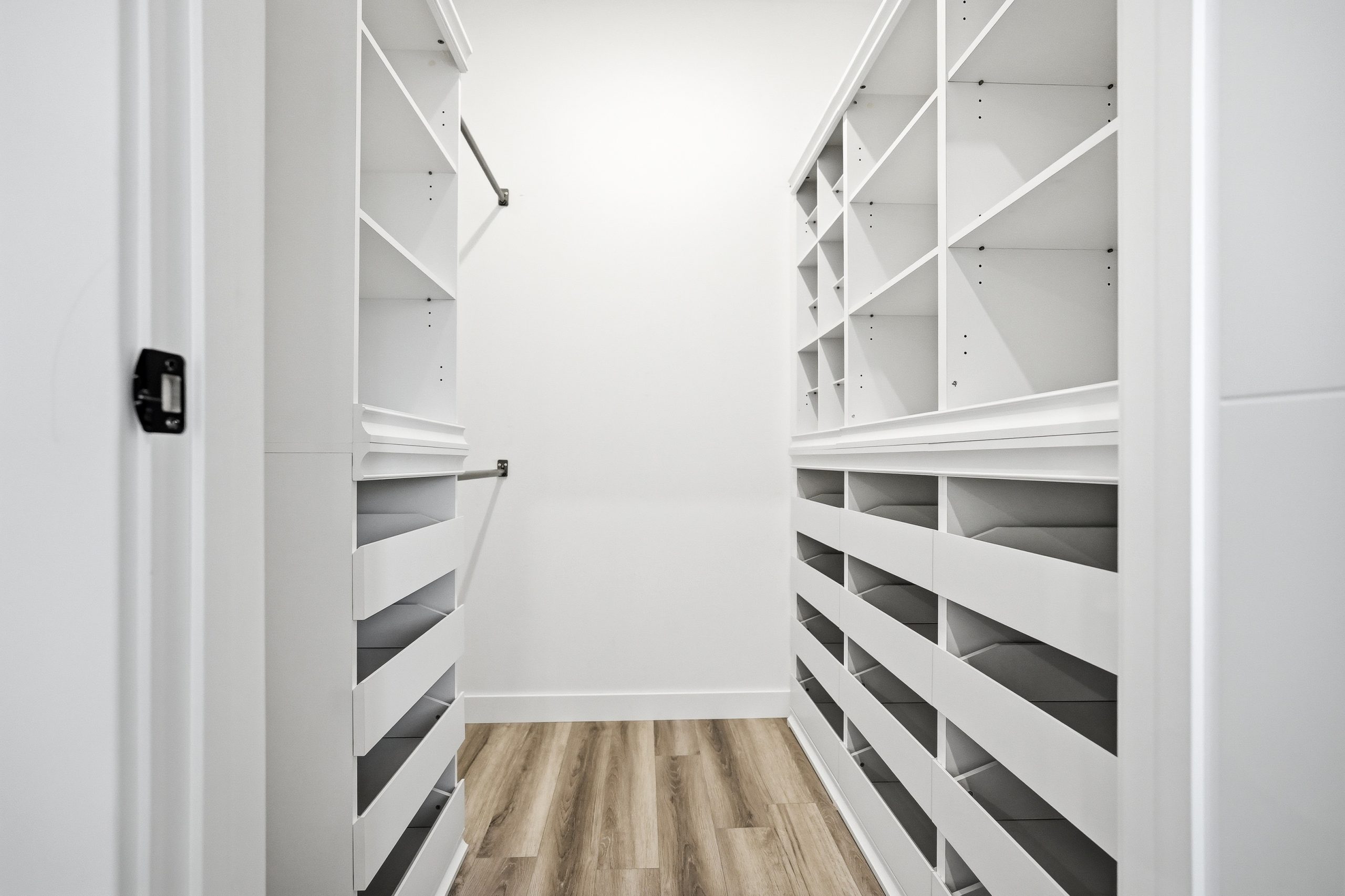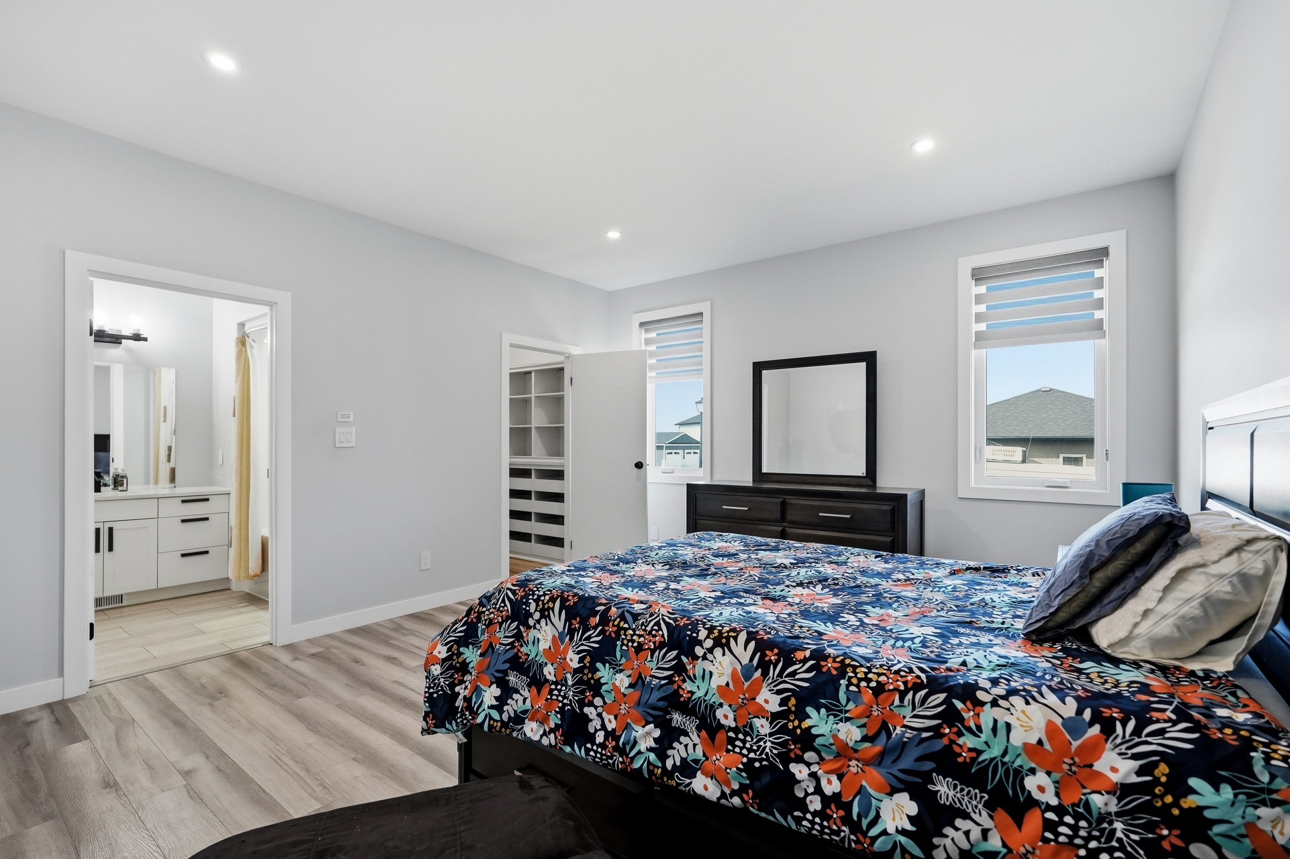 The spacious primary suite includes a walk-in closet with custom built-ins. Additional bedrooms also feature custom cabinetry. Storage is abundant throughout the home, creating excellent everyday functionality.