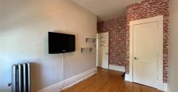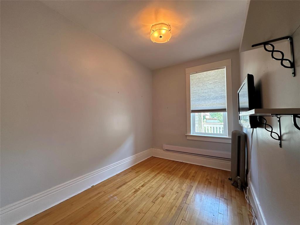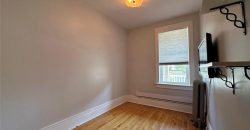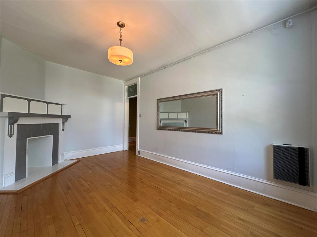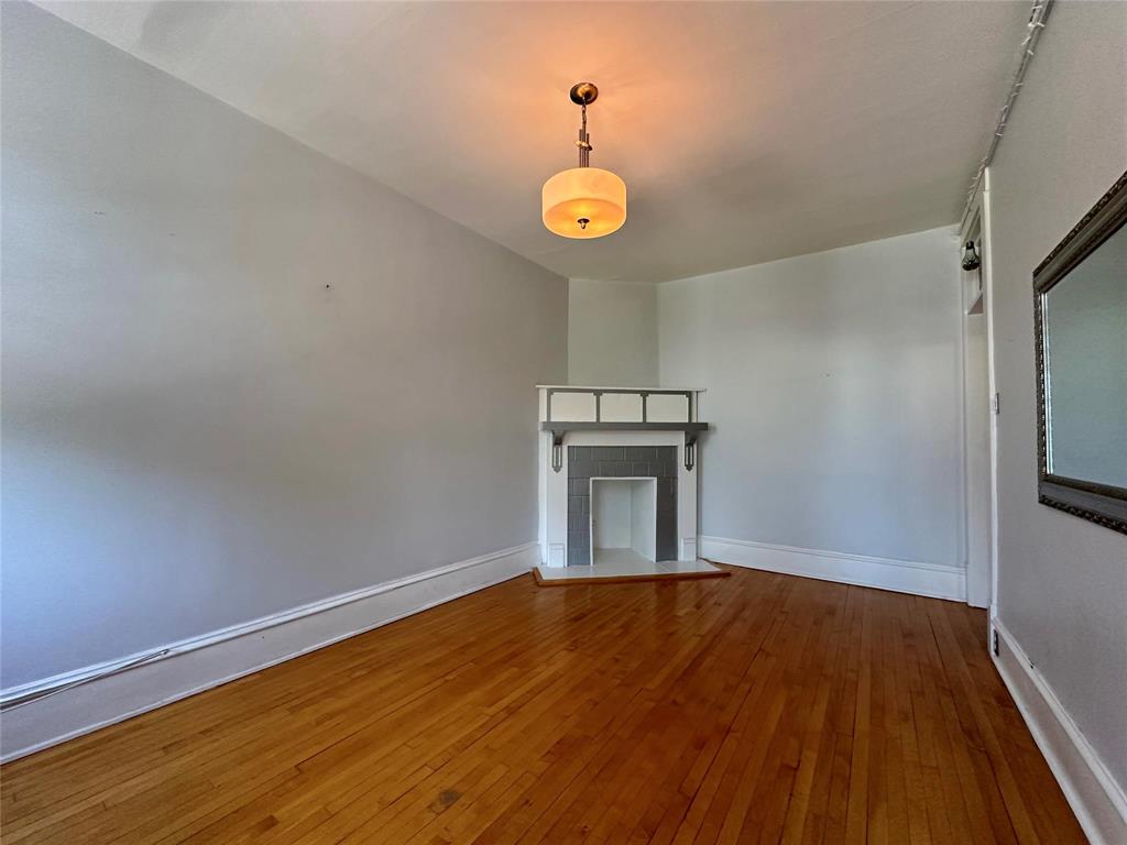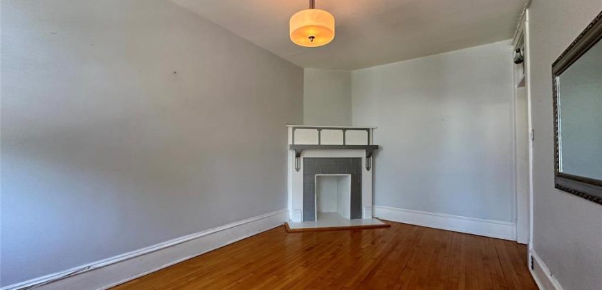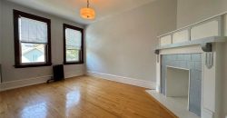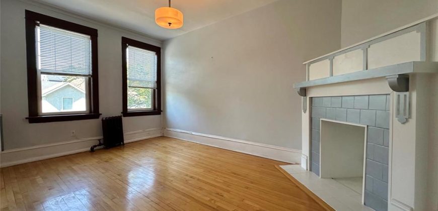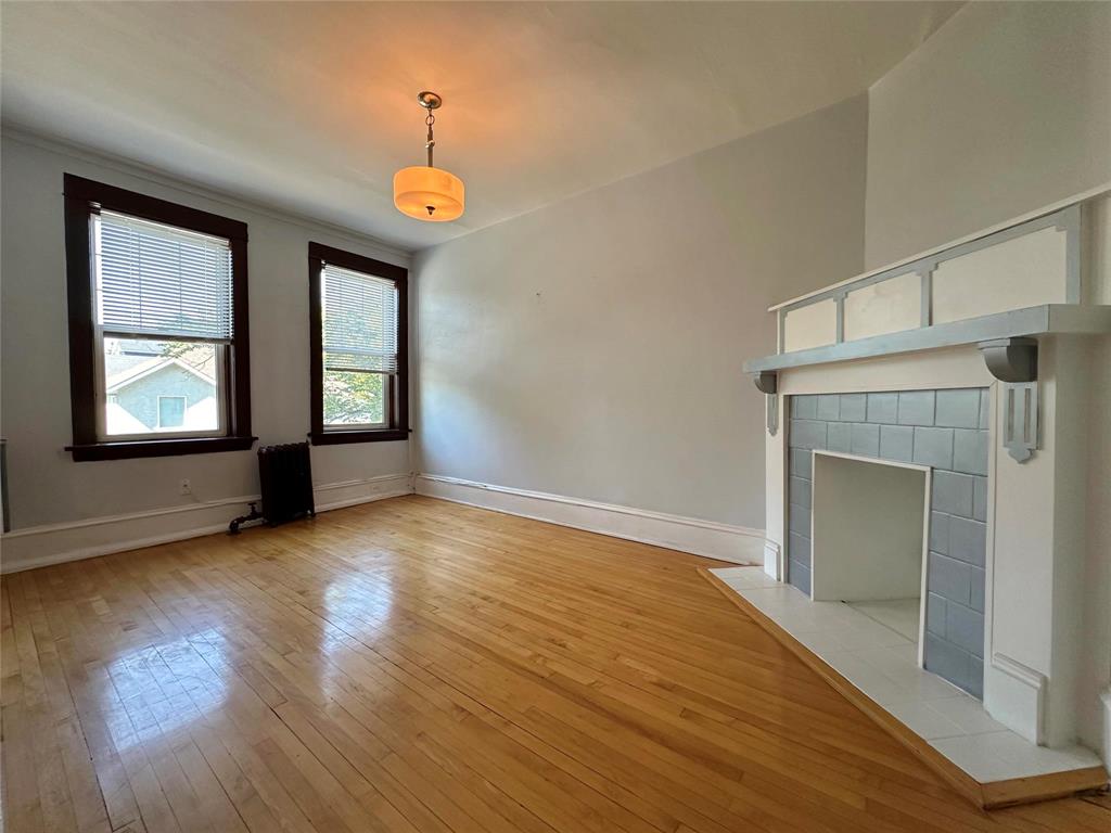 Spacious Living Room: Overlooking tree-lined Harrow Street, the living room features a stunning wood mantle, perfect for cozy evenings.