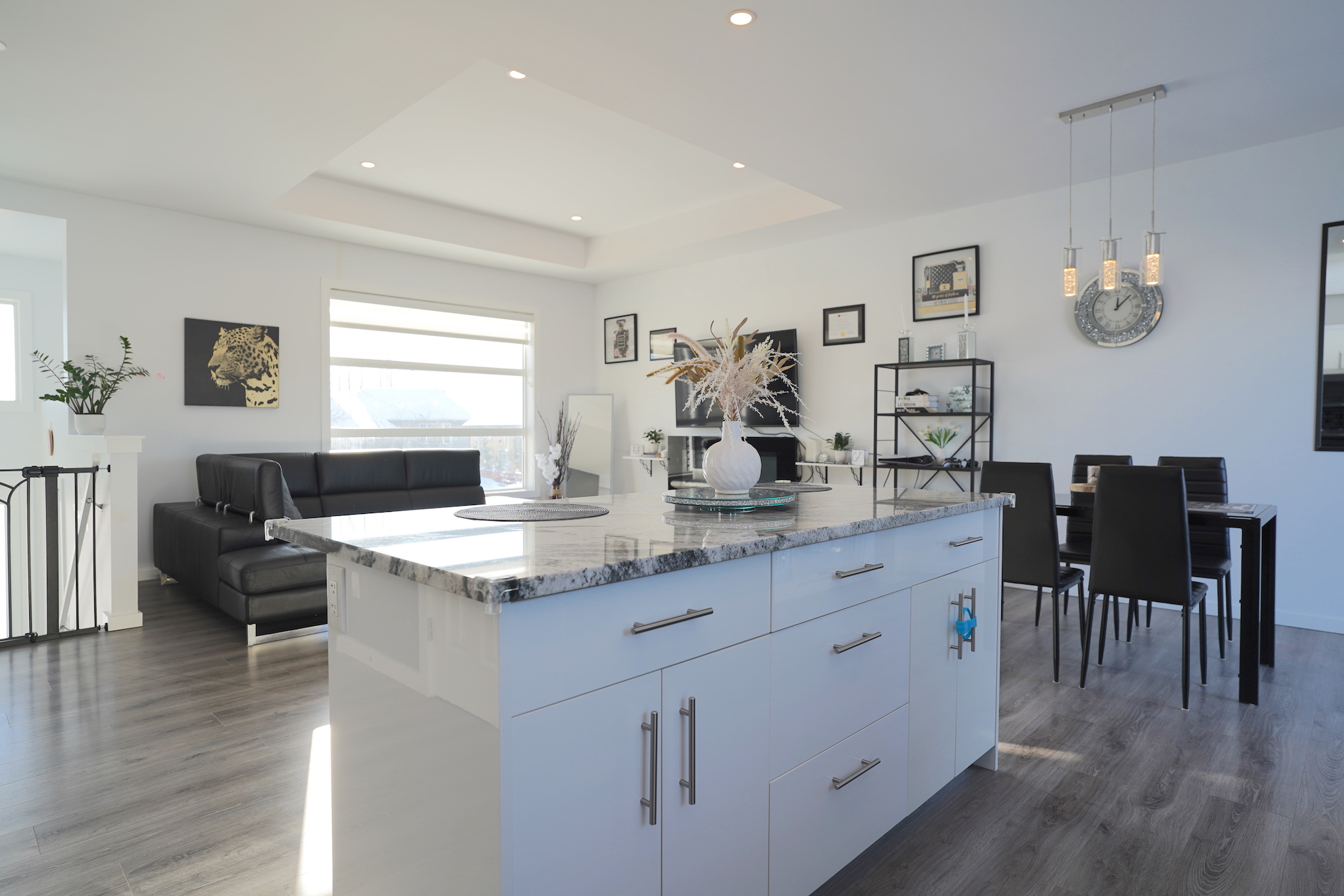 - Open concept main floor with 9-foot ceilings + tray ceiling in living room