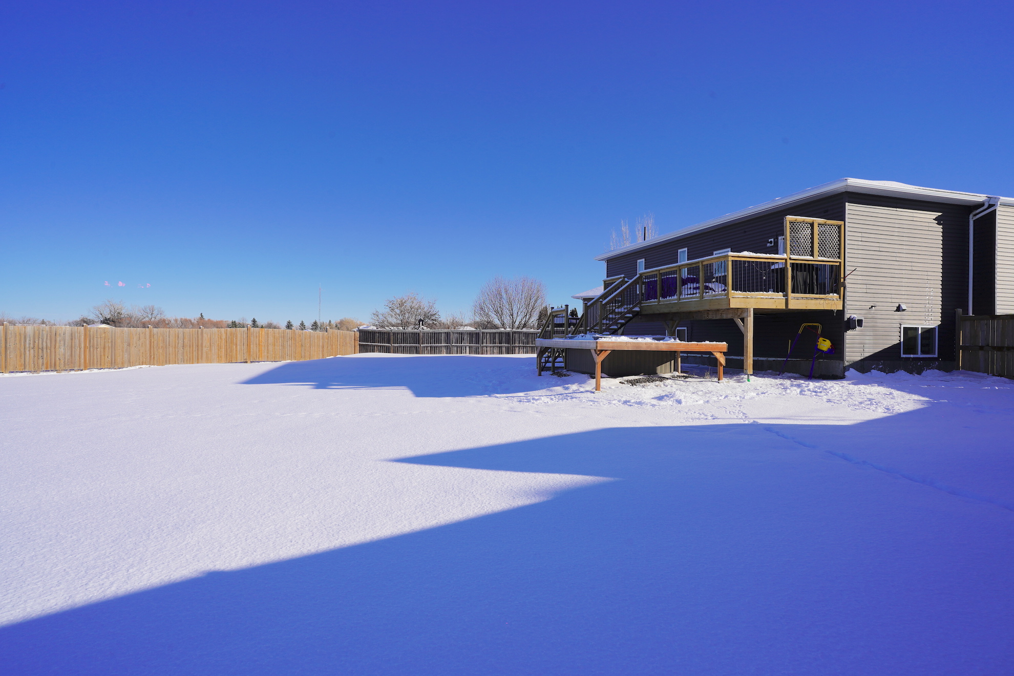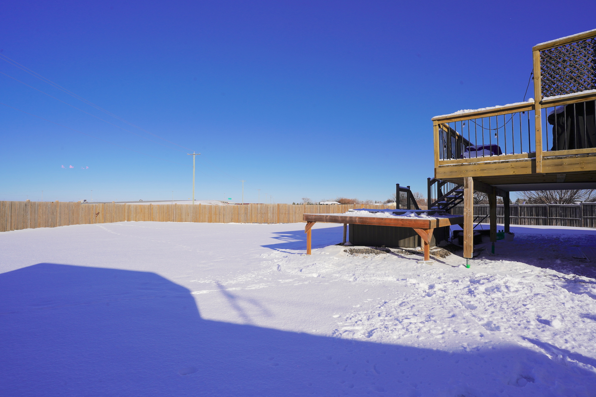 - Oversized fenced lot with a two-tier deck and hot tub area