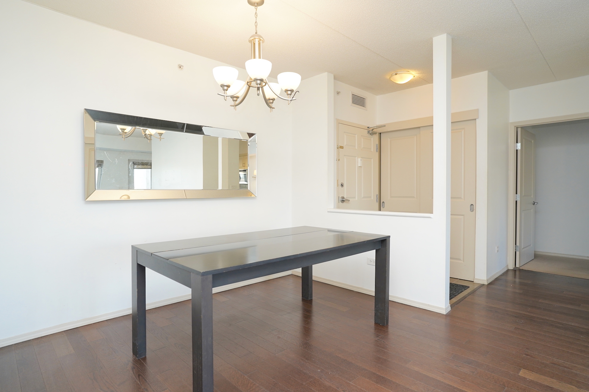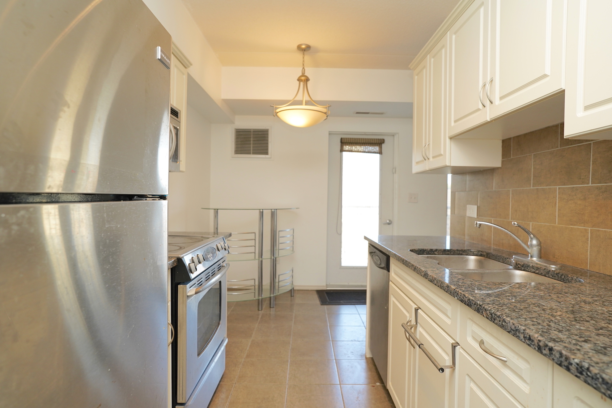 The bright kitchen features white shaker-style cabinetry, granite countertops, and quality flooring, seamlessly flowing into the living and dining area with access to your private balcony.